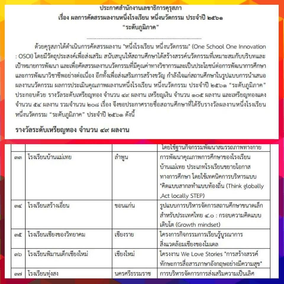 รางวัลเหรียญทอง ระดับภูมิภาค หนึ่งโรงเรียนหนึ่งนวัตกรรม